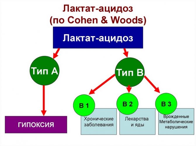 - Тип Б – возникает из-за неправильного образования и вывода кислоты. Молочная кислота вырабатывается в избытке и не утилизируется при сахарном диабете, печеночных патологиях.