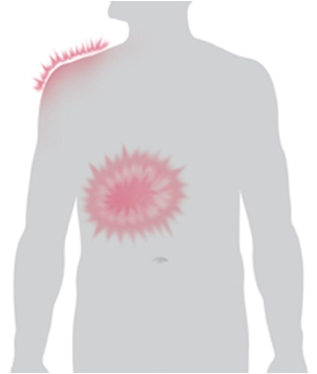 Боль острая и пульсирующая, локализована слева за грудиной. Иррадиирует: