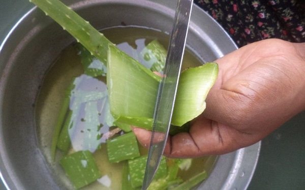 - 4-5 листьев алоэ (длиной около 15 см) режутся на кусочки по 3-4 см;