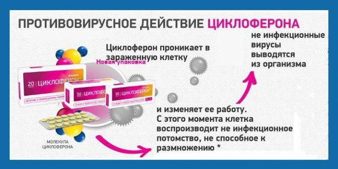 Рассматриваемый лекарственный препарат оказывает сразу два выраженных эффекта: иммуномодулирующий и противовирусный. Кроме этого, Циклоферон оказывает и слабо выраженные противоопухолевое, противовоспалительное и антипролиферативное действия. Циклоферон в любой своей фармакологической форме активирует костномозговые стволовые клетки и обеспечивает образование гранулоцитов. Если опустить фармакологические термины, то можно выделить следующие возможности рассматриваемого лекарственного препарата: