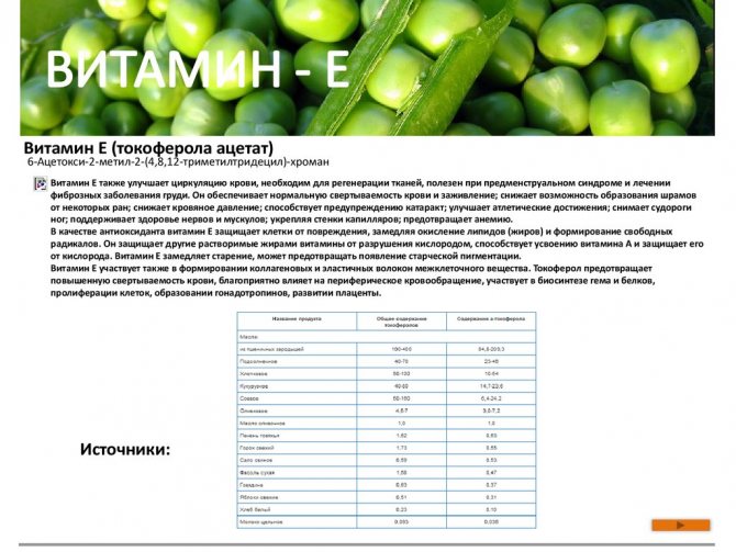 Главное действующее вещество – витамин Е или токоферол. Он представляет собой жирорастворимое соединение, которое принимает участие во многих биохимических процессах в организме человека и крайне необходимо для обеспечения здоровой структуры и нормального функционирования клеток.